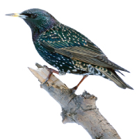 Starlings are well adapted to urban life which offer it an abundance of food and nesting sites. It is a muscular bird about eight inches long with long wings and a short squared tail. Starlings are very aggressive and will drive native birds out of their territory, much to the dismay of local bird watchers. Starlings are well noted for their flocking habits. They often gather in the tens of thousands, creating a nuisance when roosting in populated areas.